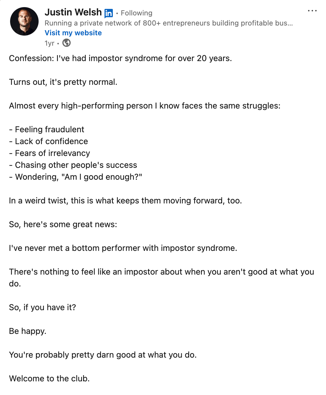 I kept a screenshot of a post I saw a year or so ago by Justin Welsh ($10M+ creator).