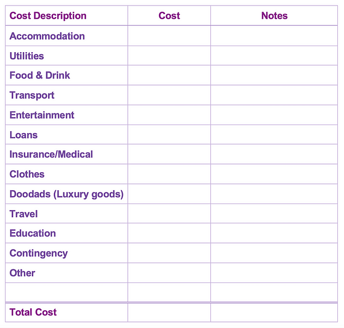 Create your own table similar to the one below with the categories relevant to your lifestyle vision, and start calculating your freedom budget!