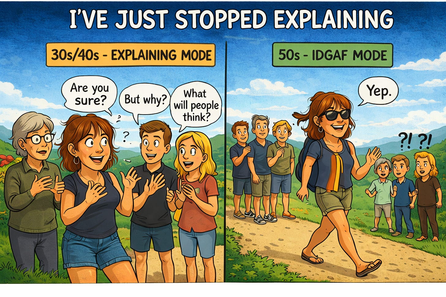In my 30s I’d make a big decision and then spend weeks justifying it to everyone around me. In my 40s I’d still explain, but a bit quicker. By my 50s I just... stopped.
