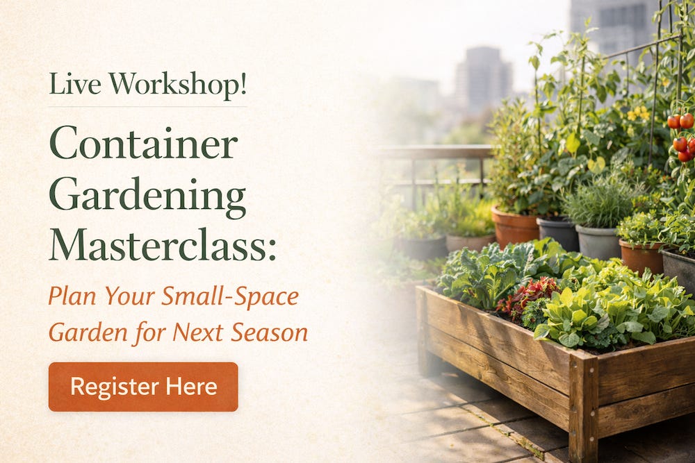 She plans a live workshop on Zoom: Container Gardening Masterclass: Plan Your Small-Space Garden for Next Season.