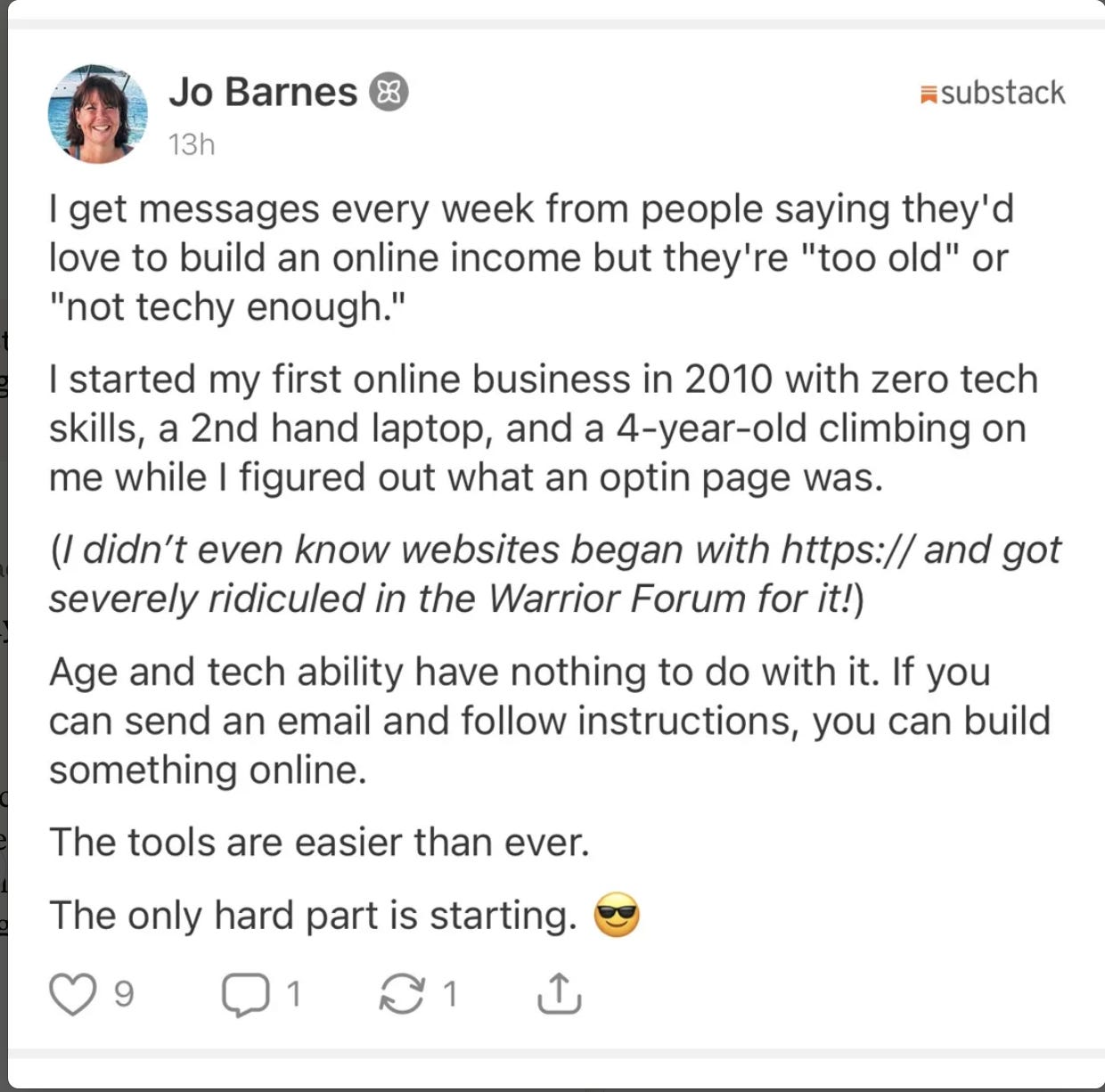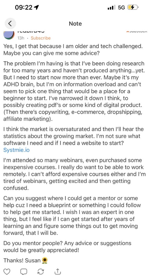 I have a course called ‘Start the Right Side Hustle (How to Go From Stuck to Started)’ on Gumroad that walks you through exactly this process, step by step. It’s normally $47, but I’m going to give it to you for free. Keep your eye on your Substack inbox for access details.