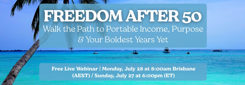 Join me on 28th July for Freedom After 50! A free live workshop for 50+ freedom seekers who want to fund their travels, create a flexible lifestyle, and finally stop waiting for “someday.”