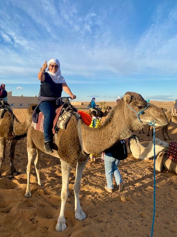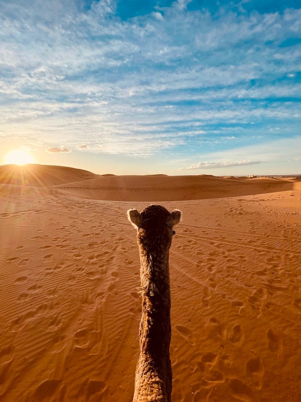 But once you’re up there, after the camel finds its rhythm, and you’re no longer hanging on for dear life, suddenly the desert goes quiet, the light softens and the world feels big and ancient and strangely intimate.