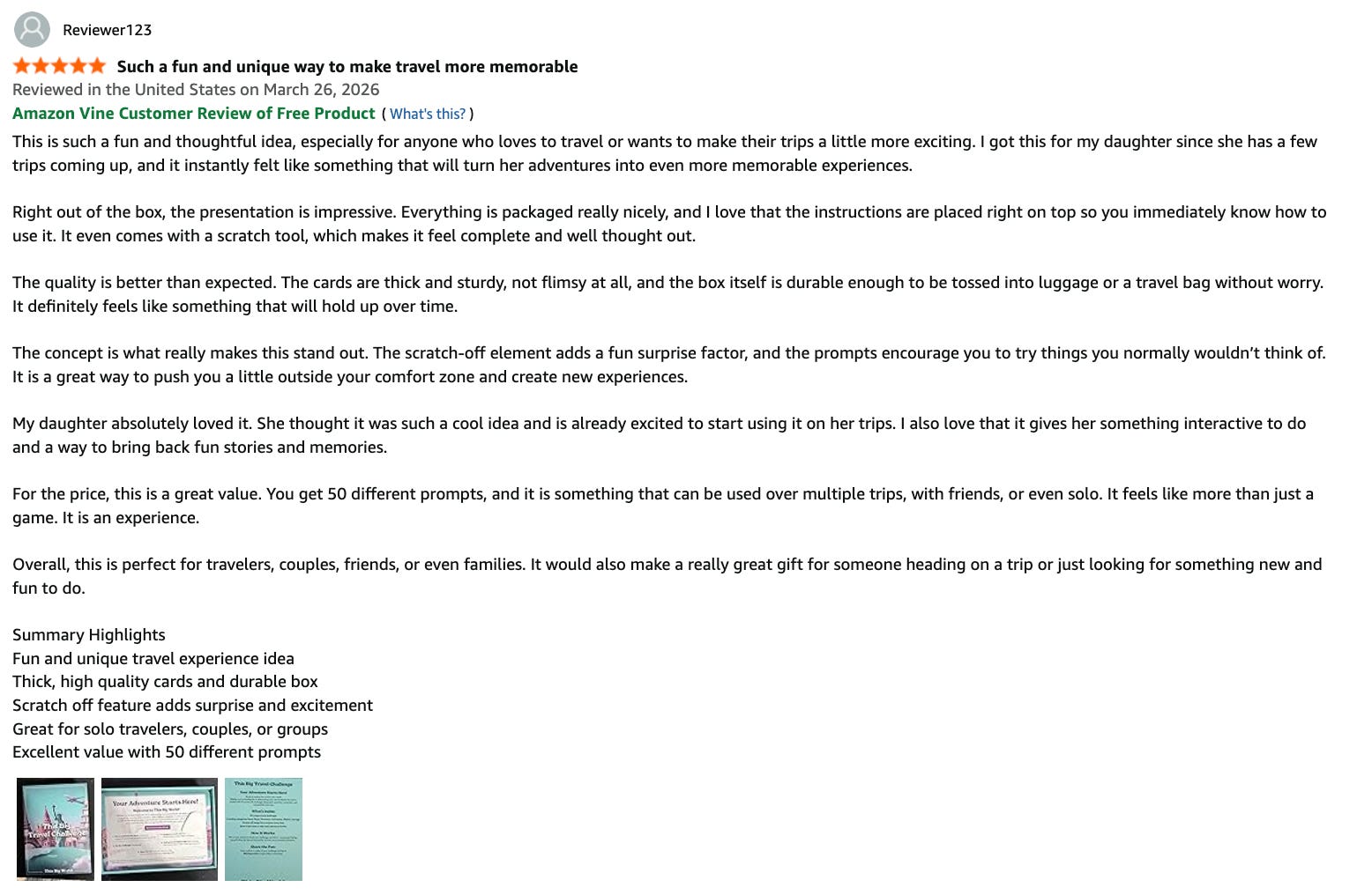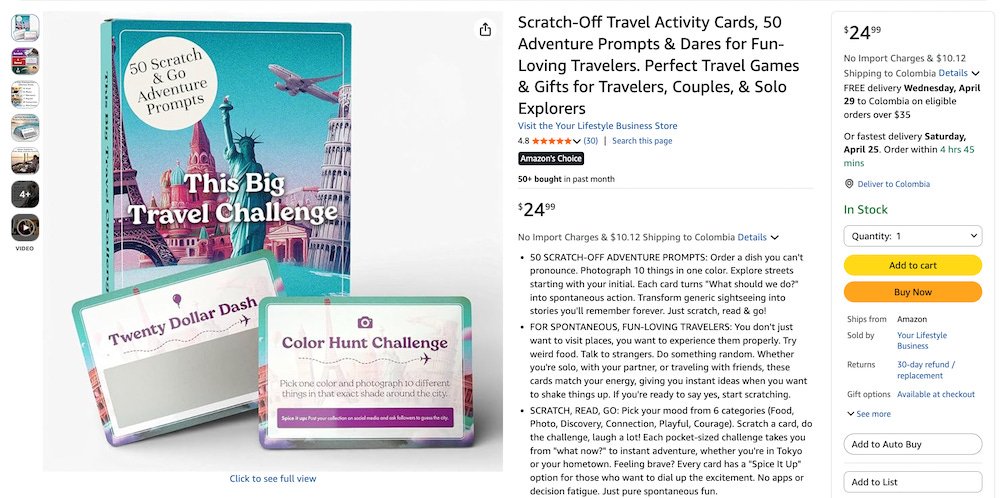I decided to start with a general travel challenge set. A simple, deck of scratch-off cards to spice up anyone’s travels. I spent a month negotiating with suppliers and another 2 months slogged through artwork rounds, packaging, listings, Amazon setup, the lot.