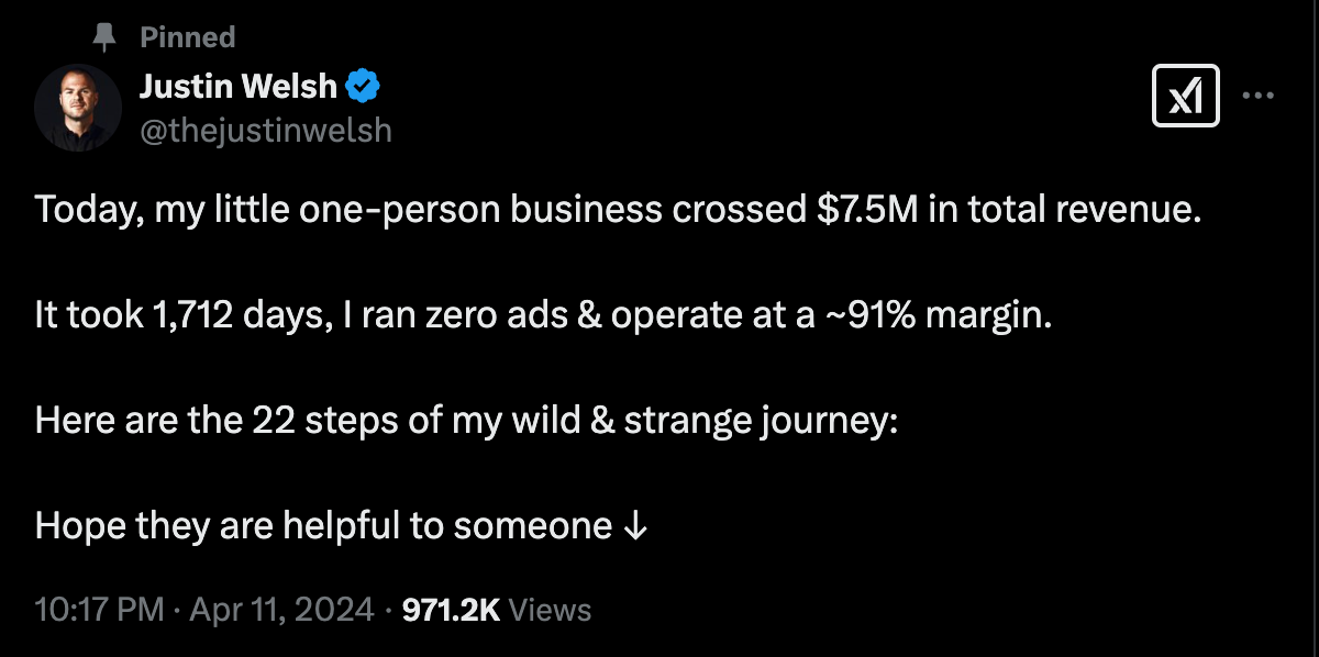 Here's Justin Welsh's sharing his 22 step plan for how he went from Zero to $7.5m in revenue, as an example.