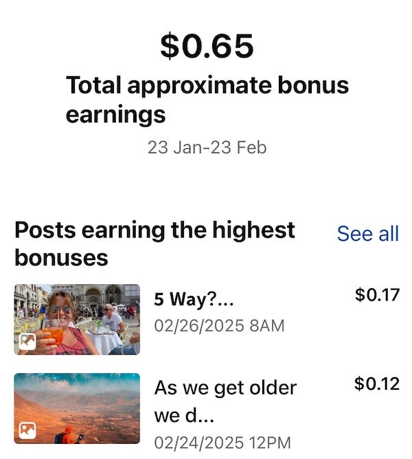 The results are already showing: my views on Instagram have jumped from a measly 20 views a week to 888 last week. And I've earned a whopping $0.65 from my Facebook content last month! Yes, we're off to the races! 😂